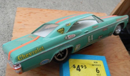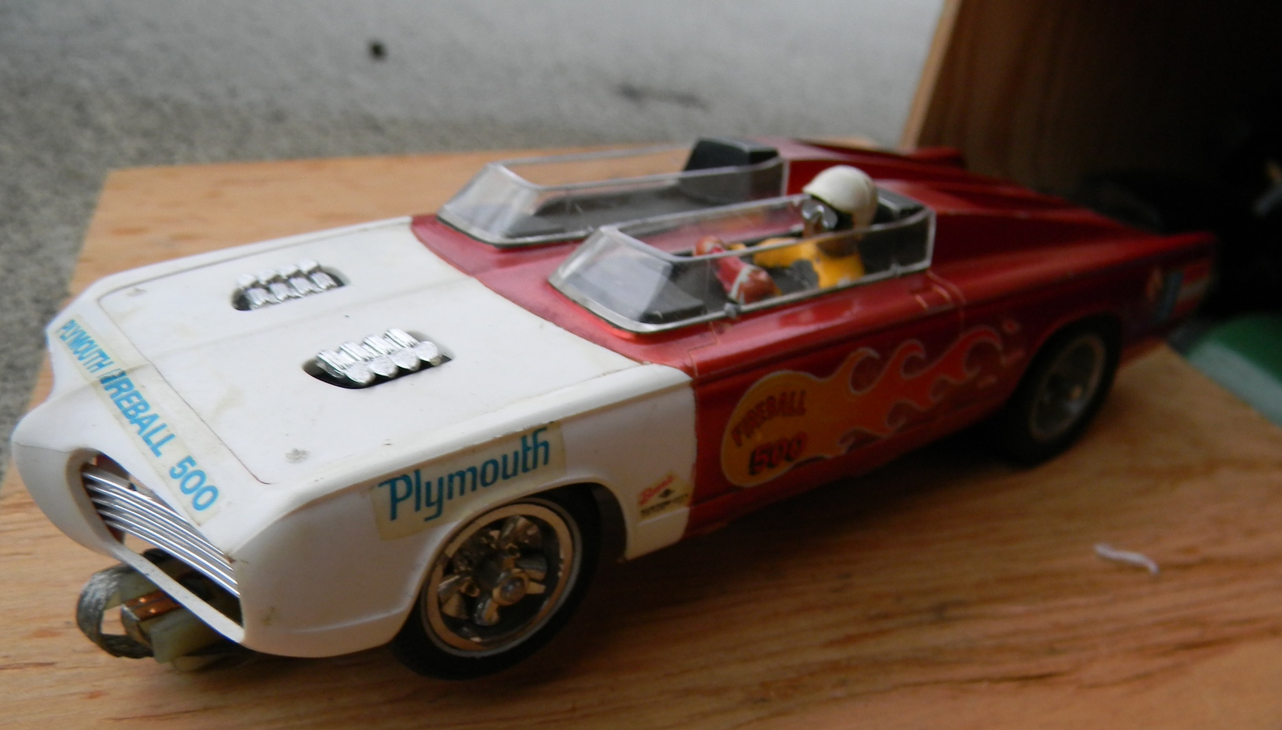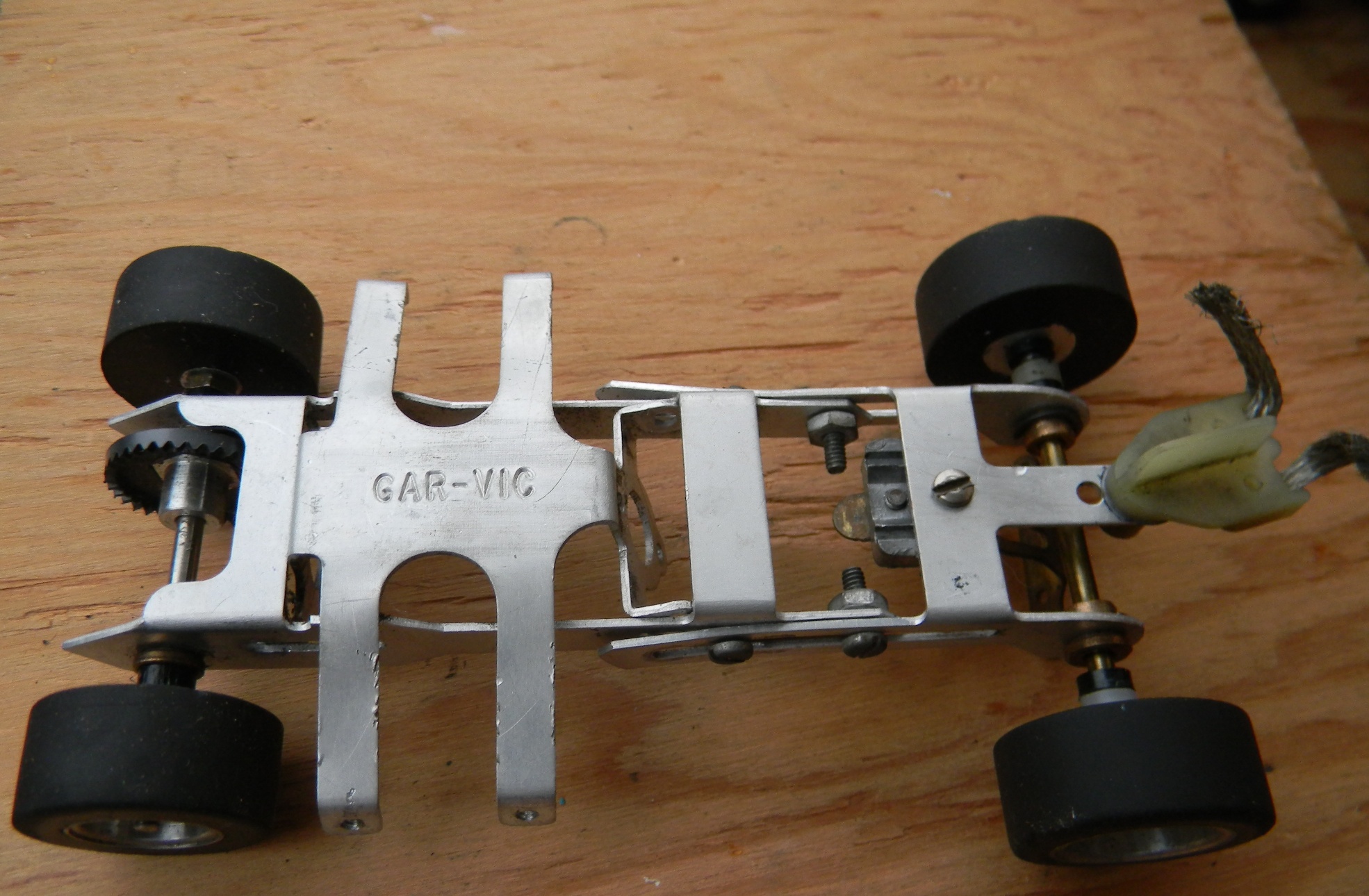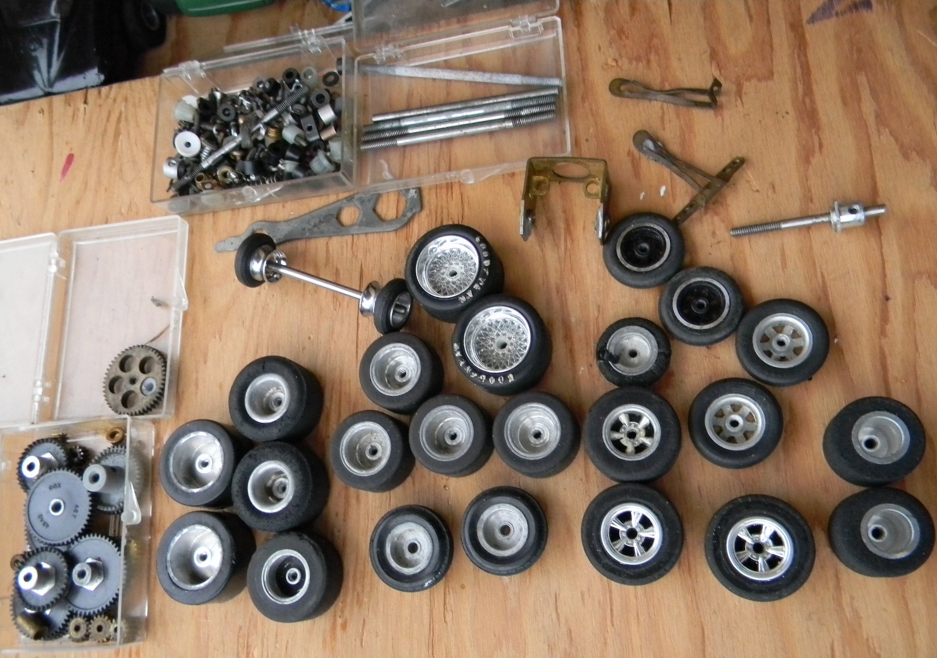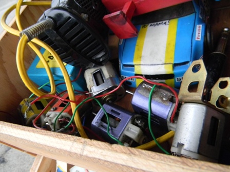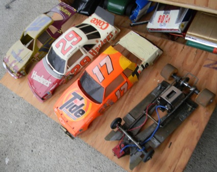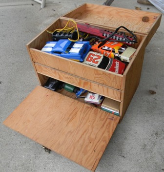As of 2011, I am 49 and was racing slot cars in the early 80's. my father-in-law gave me his vintage collection of cars from when he raced in his 20's and 30's (which would put his stuff in the 1950's and 60's), parts, and box - and I used to take them with me when I would race. Everything is here - bodies, engines, multiple chassis, wheels, axles, brushes, gears, controllers, stickers, and tons of other parts. The chassis include "Classic" and "Gar-Vic", engines include a rare square, bodies include a rare Plymouth Fireball 500. These are standard "model" size, not the little slot cars you see in stores. I am in the process of getting educated on what I have. I am hopeful to meet with someone knowledgeable in the Salem OR area. At this time I am looking to sell everything I have as a package. There are more bodies and parts than what are shown, but I took photos of most of it. I'm not sure what other jewels can be found in those bins. Email me or call 503 SEV3N F0UR THR33 N1NE N1N3 N1NE N1N3 to make me an offer. Click the photos to see large versions |