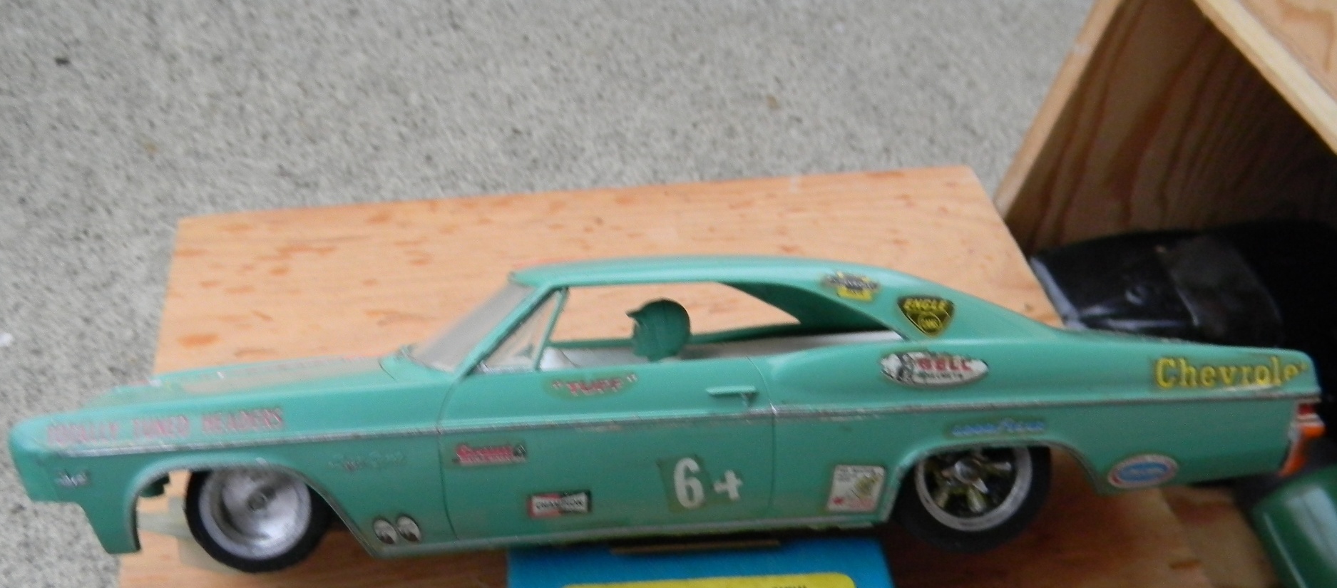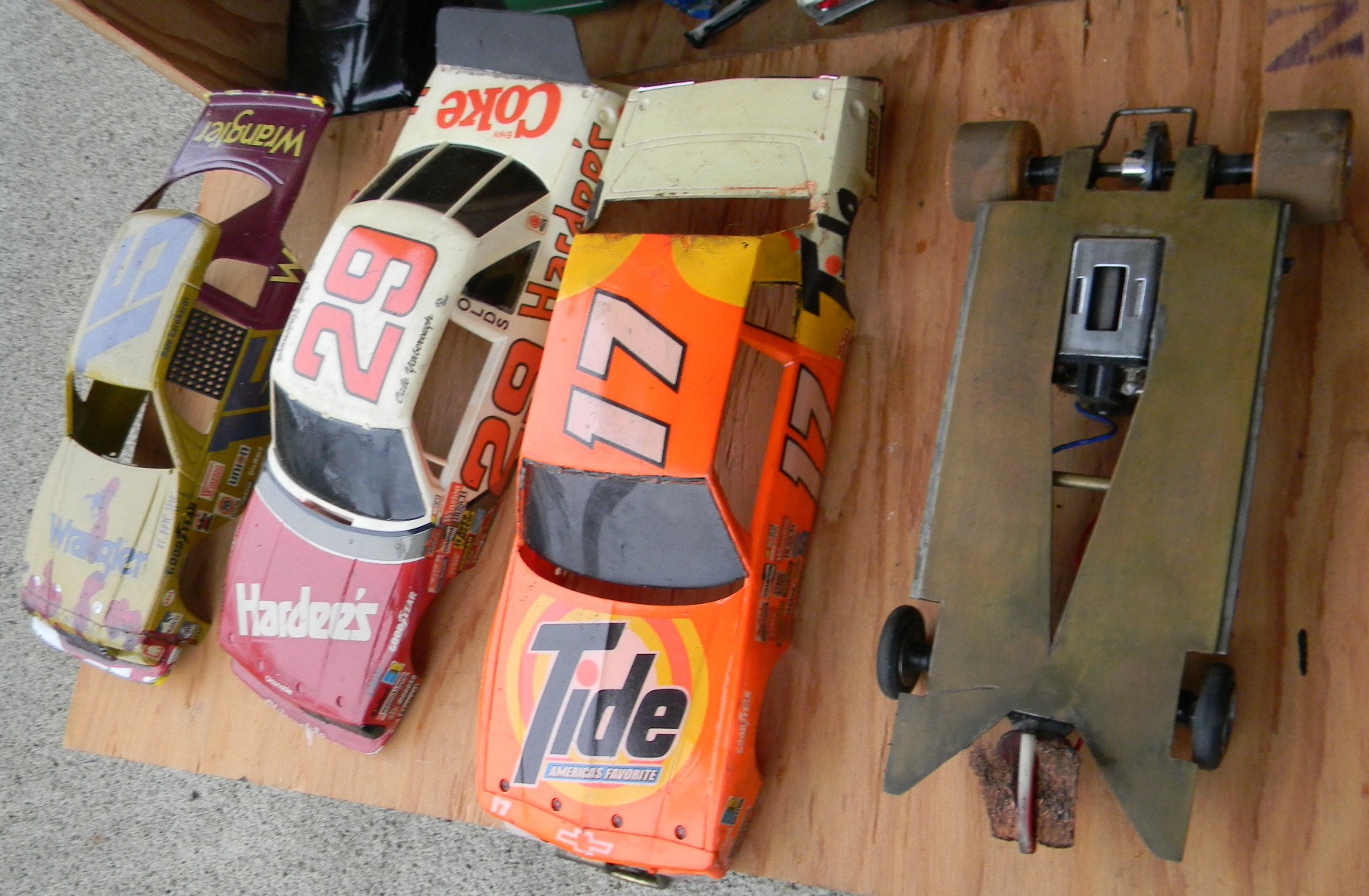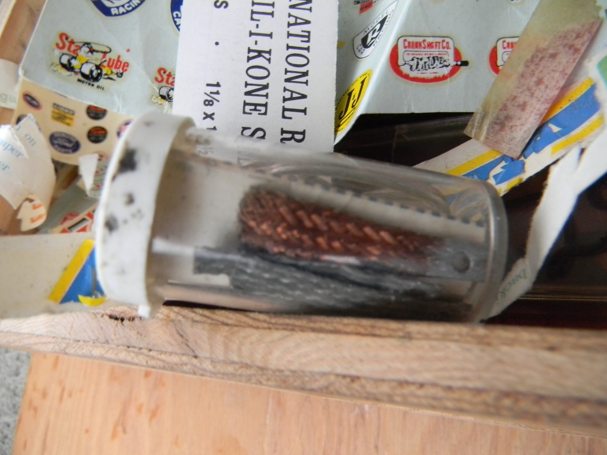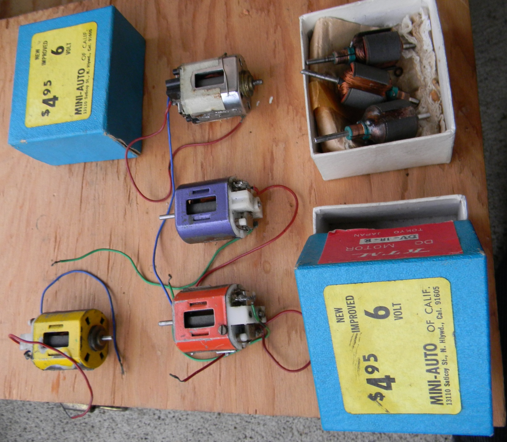 As of 2011, I am 49 and was racing slot cars in the early 80's. my father-in-law gave me his vintage collection of cars from when he raced in his 20's and 30's (which would put his stuff in the 1950's and 60's), parts, and box - and I used to take them with me when I would race. Everything is here - bodies, engines, multiple chassis, wheels, axles, brushes, gears, controllers, stickers, and tons of other parts. The chassis include "Classic" and "Gar-Vic", engines include a rare square, bodies include a rare Plymouth Fireball 500. These are standard "model" size, not the little slot cars you see in stores. I am in the process of getting educated on what I have. I am hopeful to meet with someone knowledgeable in the Salem OR area. At this time I am looking to sell everything I have as a package. There are more bodies and parts than what are shown, but I took photos of most of it. I'm not sure what other jewels can be found in those bins. Email me or call 503 SEV3N F0UR THR33 N1NE N1N3 N1NE N1N3 to make me an offer. Click the photos to see large versions |